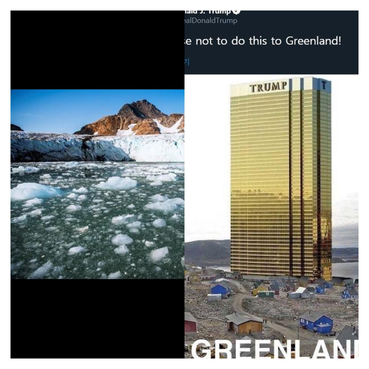 우:그리난드의 녹아내라는 얼음, 좌:트럼프의 합성 사진
