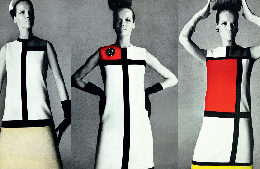 이런 그들의 아이디어는 다양한 방면에 영향을 미치는데, 유명한 패션 디자이너 입생로랑은 1966년 쇼에 몬드리안을 오마쥬하는 디자인을 선보입니다.