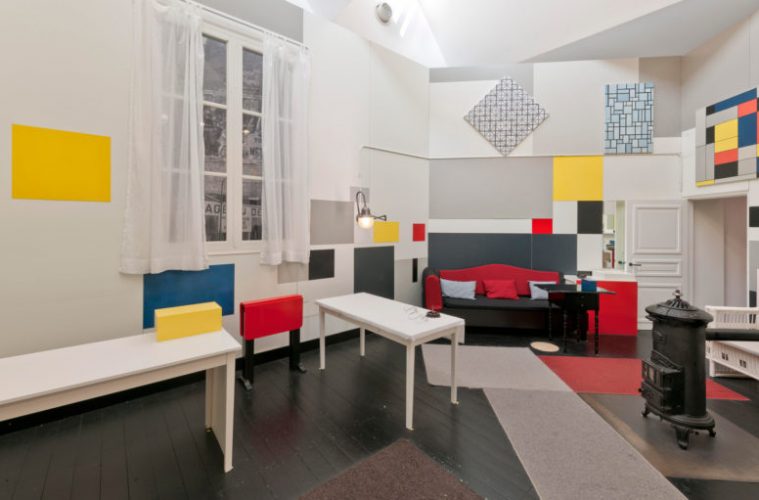 남아 있는 파리 시절 스튜디오 사진을 토대로 재구성한 몬드리안의 공간은 화로와 테이블 등이 좁은 공간 안에 비좁게 자리 잡고 있으면서 그의 그림에서 느꼈던 모서리 없이 깔끔하게 정돈된 모습일 거라는 일반의 생각을 뒤집습니다.