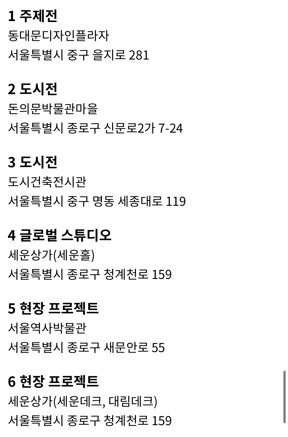 서울도시건축비엔날레의 위치들. 서울 이곳저곳 넓게 퍼져 진행한다.