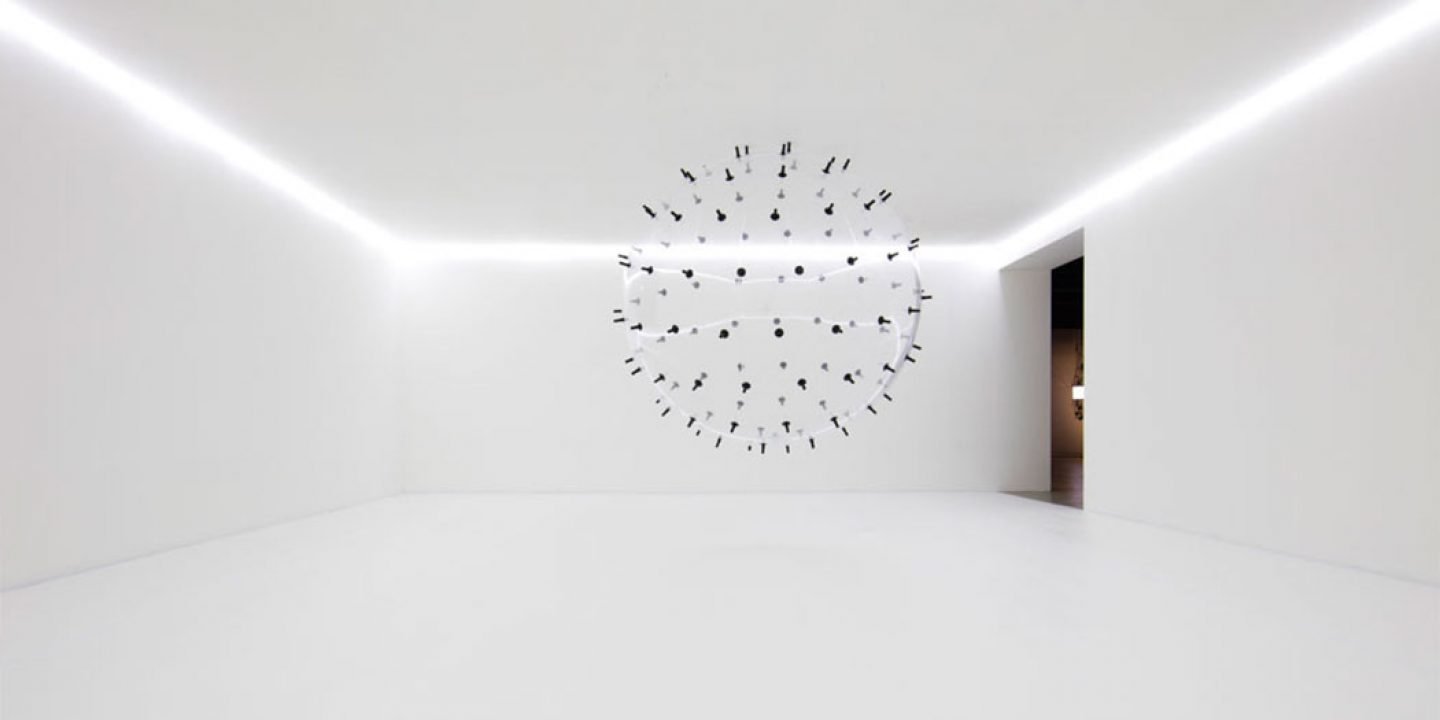 This captioned movie features an installation by Munich-based artist Karina Smigla-Bobinski. Called Ada, it features a huge helium balloon covered in charcoal spikes, which create patterns on the surrounding white walls.
