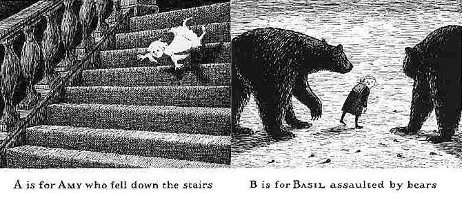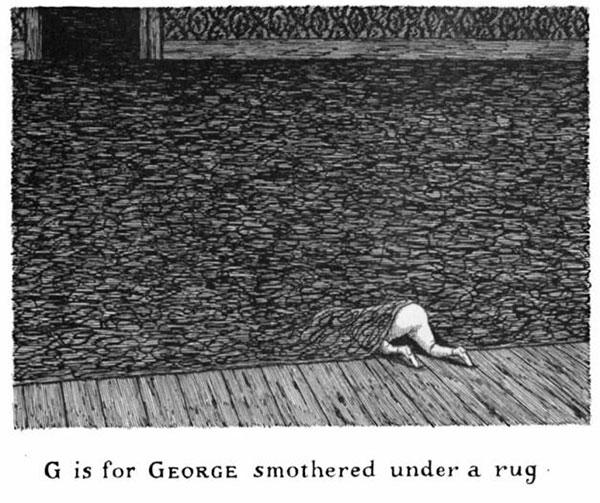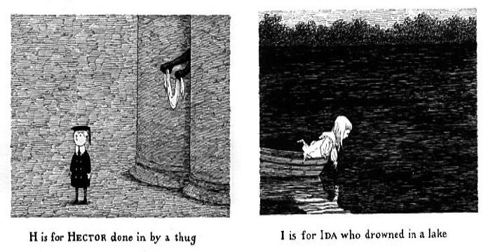 실제로 팀 버튼이 출간한 그림책 <굴 소년의 우울한 죽음>은 에드워드 고리의 그림책 <펑 하고 산산조각 난 꼬마들>을 똑 닮았다. 제목부터 범상치 않은 이 작품엔 알파벳 순서대로 이름 지어진 26명의 꼬마가 등장한다. 누가 등장하든 내용은 딱 한 가지, 저마다 다른 방식으로 죽어 나가는 것. 계단에서 굴러떨어진 에이미로 시작해 양탄자 밑에서 질식한 조지를 거쳐 진을 너무 많이 마신 질라로 끝나는 이 이야기의 첫인상은 피폐하고 엽기적이다. 음울하다 못해 끔찍한 일러스트, 감정이라곤 하나도 실리지 않은 건조한 문체.