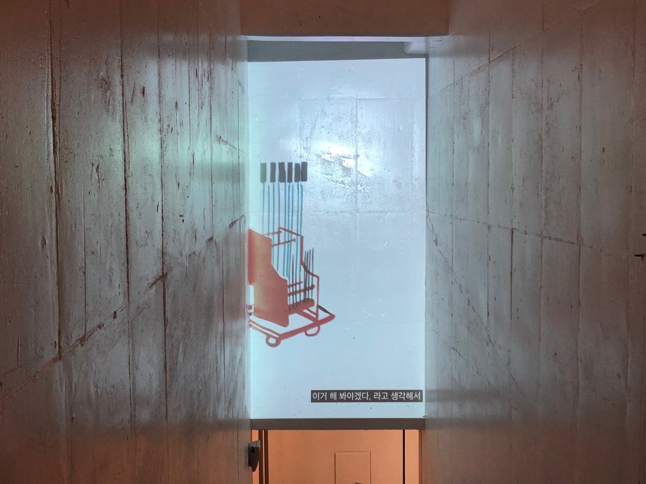 영상은 전시장을 향하는 계단 위에 설치되었습니다. 편안한 감상은 어려울 수 있으나, 쉬어가는 시간도 가질 겸 계단 끝에 잠시 걸터앉아 영상을 꼭 감상하시기를 권합니다.