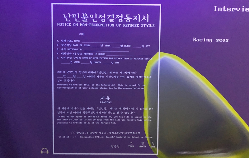 영상이 재생되고 있는 전시실의 벽면을 자세히 살펴보면 ‘활동범위 등 제한 통지서’, '출국기한 유예 허가 통지서’, ‘난민 불인정 결정통지서’ 등 낯설지만 동시에 익숙하게 느껴지는 서류 이미지들을 확인할 수 있습니다. 현대 사회에서는 서류 한 장으로 한 개인의 인생이 통째로 부정되기도, 혹은 받아들여지기도 합니다. 벽면을 바라보다 보면 데이터에 따라 인간의 이주나 거주가 결정되는 현대 사회의 특성이 기이하고 낯설게 느껴집니다. 한 개인의 인생이 문서화되고 데이터화 될 때, 그것의 이동과 폐기는 용이하게 됩니다. 그러나 정작 한 개인의 인생이 담고 있는 깊이 있는 이야기들은 쉬이 삭제되어 버리기도 합니다. <다공성 계곡 2: 트릭스터 플롯>과 벽면에 설치된 작품 <플롯 다이어그램>은 모든 것을 ‘데이터화’하는 현대 사회에 관한 무거운 비판을 가볍고 위트 있게 풀어냅니다.