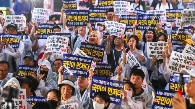 2018년 6월 30일 광화문 동화면세점 앞에서 일어난 제주도 예멘 난민 반대 집회. 맞은편에서는 '인종차별을 반대한다'는 구호를 외치며 난민 반대 집회를 반대하는 집회가 열렸다