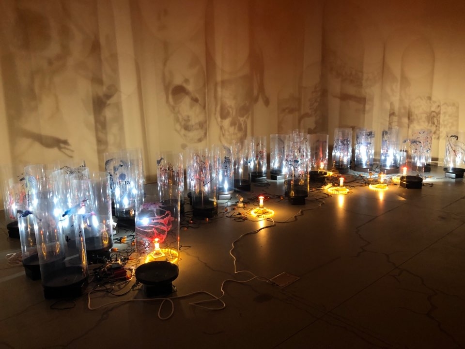 이 작품은 날라니 말라니의 <판이 뒤집히다>이다. 날라니 밀라니는 역사와 사회에 대한 관심을 바탕으로 이주와 충돌, 젠더, 글로벌리즘과 소비주의 등의 주제를 다루는 설치 작업을 계속해왔다. <판이 뒤집히다>는 개인의 삶을 위협하는 온갖 종류의 폭력과 재난들에 대한 우화를 상징적으로 표현한 작품이다. 전시장 벽에는 성경, 신화, 역사에 등장하는 이야기들이 투사되고 있다. 이는 19세기 뱅골 서부에서 발원한 칼리가트 방식으로 표현되어 있다. 바닥에 설치된 조형물과, 그로부터 투사되는 역사적이고 신화적인 이미지가 황홀감을 불러일으키고 있는 것이다.