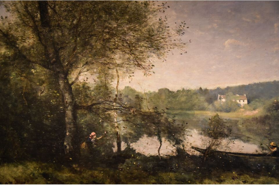 허나 인상주의자들은 결코 어느 순간 독립적으로 생겨난 화파가 아니다. 그들의 야외작업과 풍경에 대한 관심은 낭만주의자인 컨스터블과, 빛에 대한 관심은 마찬가지 낭만주의자인 터너의 영향 하에 있었다. 그리고 야외작업과 세상을 바라보는 차가운 태도에 있어서는 사실주의, 특히 바르비종파의 영향을 짙게 받았다. 1800년대에 이르러 바르비종의 퐁테블로는 관광지로 빠르게 급부상했고, 특히나 도회적인 관광지가 아니라, 속세를 잠시 잊을 수 있는 날 것 자체로의 자연을 관조하는 관광지였다. 도시에서 마주하지 못한 살아 숨 쉬는 동식물들과, 노동 및 수렵과 같은 근원적 노동이 잔존하는 공간, 시간, 기후에 의해 즉각적으로 변화하는 그 풍경은 화가들에게도 큰 영감의 대상이 되었다. 본 전시에서는 장 바티스트 카미유 코로와 샤르 프랑수아 도비니가 소개되며, 이들의 특징으로는 이전 시대의 이상적인 요소만 취합하던 풍경화와는 달리, 있는 그대로 살아 숨 쉬는 자연을 야외에서 고스란히 옮겨내고자 하는 태도라 할 수 있다. 카미유 코로의 <아브레이 마을>부터 살펴보자. 당대 발명된 주석튜브를 이용한 야외 작업 속에서 견고한 재현이란 대단히 어려운 일이었다. 이 같은 작업방식과 매체성으로 인해 뭉뚱그려진 색채가 강조되고, 향후 인상주의에서 온당 붕괴되어버릴 형태감이 예고되고 있다. 하지만 그것은 시간과 기후에 의해 변화하는 시각과도 관련된다. 이상적인 고전 풍경화 속에서 찾아볼 수 없는 특정한 공간, 시간은 바르비종파에 의해 부활된다. 한편 인상주의자들의 색채 그 자체의 강조에 비한다면, 본 작품에서도 비춰지듯 바르비종파들의 작품에서는 비교적 객관적인 형태가 여전히 남아있다. 물론 그 형태 간의 경계는 명확하고 견고한 선이 아닌, 불분명하고 일렁이는 색에 의해 구획되고 있지만 말이다. 그것은 도비니의 <강가의 농장>에서도 비춰진다. 향후 더 자세히 비교하겠지만 그가 강물에 비친 집과 인물, 풍경을 묘사하는 태도를 보면, 이를 비교적 견고하게 묘사하려는 시도가 두드러진다. 허나 인상주의자들은 물에 의해 더욱 형태가 해체되고, 오색천연의 무수한 색채로 분화되는 그 반짝임을 포착하려 하지 않았던가.