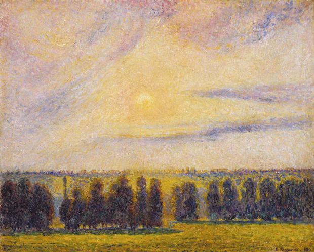 피사로의 초기 작품인 <퐁투아즈의 공장>이다. 앞서 언급한 바르비종파의 작품들과 비교한다면 더욱 급진적으로 형태감이 붕괴되고 있음을 목격할 수 있다. 또한 점묘법으로 향하기 이전의 피사로는 전형적인 인상주의의 화풍을 보여준다. 허나 피사로의 독특한 점은 바로 정치성이다. 그는 쿠르베나 밀레처럼 노동자, 농민들의 삶을 숭고하게 여겨 그가 직접 농민으로 살아가기도 했고, 특히나 사회주의자로서 부르주아지에 대한 비판은 그의 사상의 중심이었다. 그래서 본 작품의 공장, 다른 인상주의자라면 분명 새로운 시대의 풍경이자 마치 사진기처럼 풍경을 바라봄에 자연스레 포착된 시각에 다름 아닐 것이다. 허나 피사로이기에 이 공장이 내뿜는 괴괴한 연기는 공장이라는 거대한 기계의 부품으로 노동계층을 전락시키는 부르주아지에 대한 비판이라 결코 생각하지 않을 수 없다. 이후 그는 신인상주의, 점묘법으로 향하게 되는데 <에라니의 일몰>은 이에 대한 관심을 적나라하게 보여준다. 비교적 두텁던 점들은 대단히 세세한 작은 점들로 환원되어있고, 인상주의의 다채로운 색채는 점묘법에 이르러 그들이 효과를 내고자 하는 하나의 색조로 귀결되고 있다. 또한 그들이 잃어버린 형태감은 다시금 견고하게 재건되고 있지만, 작품 자체의 대단히 평면적인 구도와 더불어 일체의 어긋남도 없는 견고한 짜임새의 구성은 오히려 지루함과 삭막함을 동반한다. 하나의 색채로 귀결되어버려 인상주의자들이 그려낸 일몰만큼의 매력을 느끼기 어렵다. 이후 그는 다시금 인상주의 화풍으로 회귀해 최후의 인상주의자로서 남게 되는데, <풍요로운 수확>은 이 같은 선회한 화풍과 정치적인 인상주의자로서 노동에 대한 예찬을 엿볼 수 있다. 무엇보다 줄곧 반복되는 에라니는 그가 살아온 세계로서, 그 공간에 살아가는 농민에 대한 애정, 함께 살아가는 농민화가로서 자신의 자부심을 일깨우는 소우주였다.