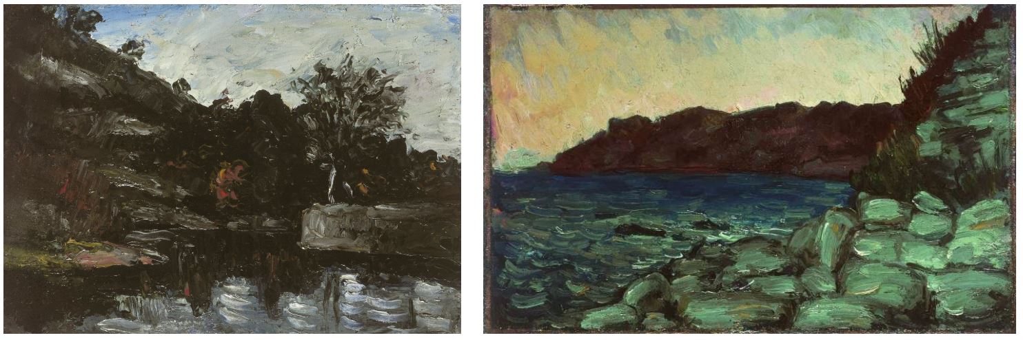 본 전시에서는 세잔의 초기시기부터 후기시기까지를 종합하여 전시한다. 그의 초기시기의 작품 <강굽이>와 <암초, 레스타크>를 살펴보자. 당대 바르비종파와 사실주의, 인상주의 시기 사이에 위치한 본 작품에서 형태감은 찾아볼 수 없다. 그저 일렁이는 마티에르의 연속, 특히 전자의 경우 경계를 분간할 수 없다. 그의 초기 대표작인 <강간>과 같은 작품에서처럼 오히려 표현주의적이고 정념적인 풍경이 펼쳐진다고 할 수 있다. 다만 본 작품의 의의는 조형언어를 모색하지도 않았고, 그만의 문법이 규정되기 이전임에도 불구하고 그 경향이 스멀스멀 느껴진다는 것이다. <암초, 레스타크>에서 높게 쌓인 돌들의 경계는 선이 아닌 색채와 색채 사이의 모호함 속에서 이뤄지고 있고, 선 또한 대상의 윤곽선만을 이루는 것이 아니라, 그것 자체로 그림자를 이루거나 공간감을 형성하는 등, 초기 시절에도 선과 색을 자유분방하게 사용하는 세잔의 경향을 느껴볼 수 있다. 이후 세잔의 1890년 작품인 <강가의 시골 저택>에서 온당 확립된 그의 화풍을 느껴볼 수 있다. 인상주의시기에 세잔 역시 형태의 견고함을 고려하지 않은 것으로 보건데, 오히려 몸담고 있던 시절에 그는 이에 별 자각이 없었는지 모른다. 허나 인상주의시기를 거치고 나서, 세잔은 무너져버린 형태를 비판적으로 생각한 듯하다. 이에 그는 형태를 부활시키지만 그것은 고전적인, 3차원의 환영이나 견고한 원근법을 복권하는 일이 아니었다. 지극히 2차원적인 방법으로, 또한 조형언어를 모색하는 방법으로 이뤄졌다. 본 작품에서 건물은 원통과 사각형, 삼각형 등으로, 그리고 숲들은 하나의 원형으로 환원되어, 모두 조형들을 연상케 한다. 무엇보다 숲은 색채 자체가 원형을 이루며 형태를 이룰 수 있음을 보여준다. 또한 대지와 강, 건물과 나무의 경계를 이루는 요소들은 결코 선이나 색 단 하나로 귀결되지 않는다. 또한 색채만이 강조되어 선이 괄시되던 인상주의의 문법과도 다르게, 각자의 역할만을 놓고 다투던 양 요소들은 화해를 이루고 서로의 영역에 자유분방하게 스며들고 있다.