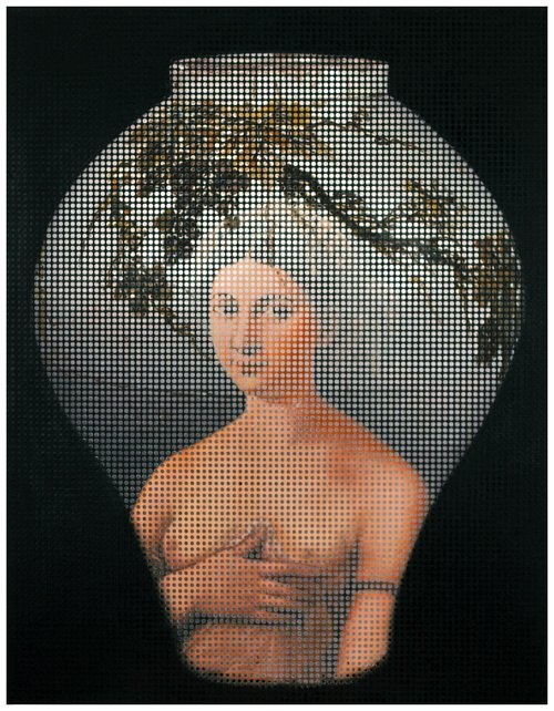 그림은 르네상스시대의 3대 화가 중 한명인 라파엘로의 작품 속 여인이다. 여인은 실제 당시 라파엘로가 사랑했던 여인으로 자신의 가슴을 드러낸 채 수줍은 표정으로 철화자기 속에 몸을 담고 있다. 작은 도트를 이용하여 완성된 작품 속의여인은동양과 서양의 고전적 아름다움이 어우러져 새롭게 다가온다. 작품은 하나의 완전한 고전의 의미로써 우리는 무엇을 읽어낼 수 있을까? 하는 질문을 던지게 만든다. 고전이란 예스러운 것이 아닌 우리가 살아가는 삶의 뿌리이다. 다시 말한다면 전통과 고전이란 촌스럽거나 고리타분한 것이 아닌 지금 현재를 만들어내는 토양이라는 것이다. 그러나 우리는 조상들이 내려준 많은 문화와 전통을 현재와는 동떨어진 것으로 생각하는 경향이 매우 짙다. 그러나 김중식 작가의 손에 의해 새롭게 태어난 작품은 어머니의 품이 가득한편안함과 고요함을 갖고 있으면서도독특한 현대적 감각이 엿보인다. 가슴을 드러낸 여인은 지금 막 세상을 마주한 생명에게 "아무 걱정 마렴! 너의 곁에는내가 있단다." 하며 입을 맞추자 금세라도 울음을 그치는 따듯한 사랑이 가득하다.