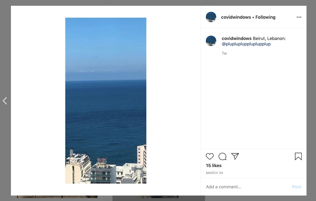창문을모티브로한또다른공동프로젝트는6년후에나타났다.지난 3월, 한인스타그램계정에파란하늘의레바논바다사진이올라왔다. 그리고곧이어이계정에는런던, 파리, 홍콩등많은나라에서찍은다양한창문풍경사진이올라오기시작했다. 계정이름 @covidwindows 는올해코로나19로인해집에서격리하고있는전세계사람들의창문풍경사진을공유하는목적을가진커뮤니티프로젝트이다. 공식프로젝트명은 <Covid Windows around the World (세계의코로나창문)>. 거실, 작업실, 침대옆이나부엌등창가자리에서바깥풍경을찍은사진을모아공유하고있으며격리중인상태라면누구나참여할수있다.