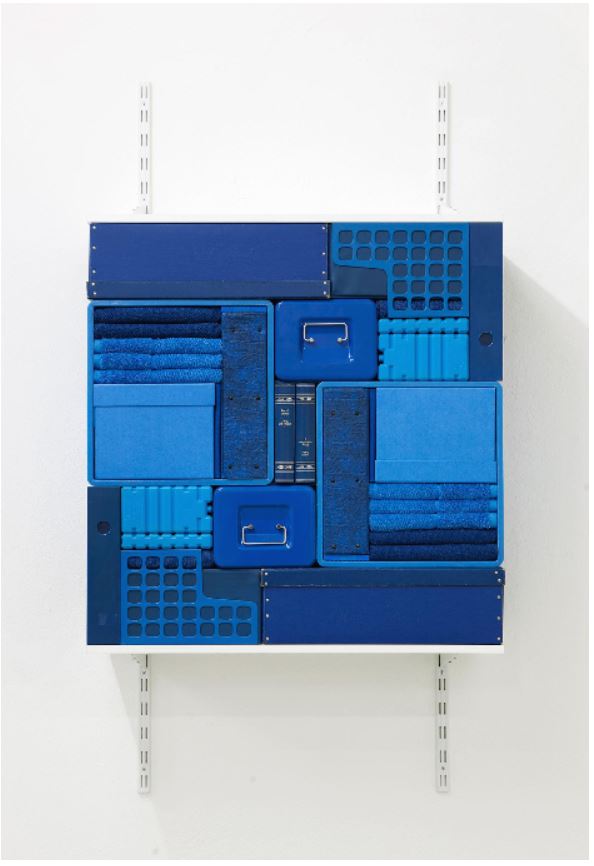 <Flip Shelf (blue)>, 2018, 파란색 물건들과 선반, 149,5x80x31 cm