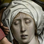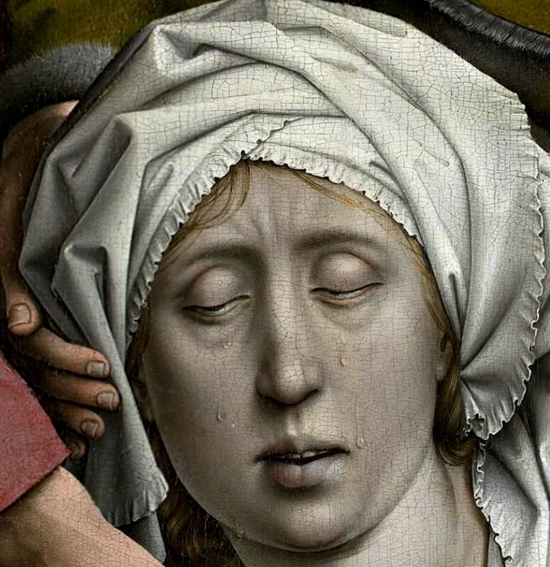 극사실주의의 선구라고 일컬을 만한 비슷한 다른 예는 얼마든지 있습니다. 역시 15세기 플랑드르 화가인 로히어르 판 데르 베이던(Rogier van der Weyden, 1400~1464)의 저 유명한 작품 <십자가에서 내려지는 그리스도>에서도 눈물 표현의 ‘사실성’은 여지없이 확인됩니다. 아들 예수의 죽음 앞에서 무너져내린 성모 마리아의 두 뺨에 눈물방울이 선명합니다.