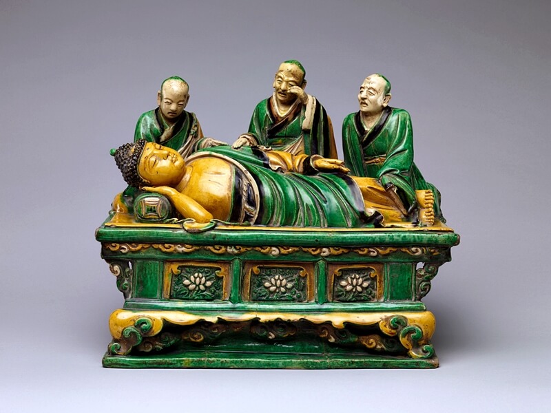 그보다 먼저 동북아시아 미술에서 그 예를 찾아볼 수는 없을까. 놀랍게도 그 구체적인 물증을 16세기 초에 제작된 중국 도자기에서 확인할 수 있습니다. 열반에 든 부처 앞에서 슬픔에 빠진 나한들의 모습을 대단히 사실적으로 빚어냈죠. 특히 가운데 인물의 동작을 주목해 봅니다. 눈가에 올린 손은 흐르는 눈물을 닦아내려는 행동임에 틀림이 없습니다.