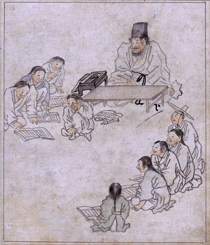 김홍도 <서당>, 《단원 풍속도첩》, 조선 18세기, 종이에 옅은 채색, 26.9×22.2cm, 보물 제527호, 국립중앙박물관