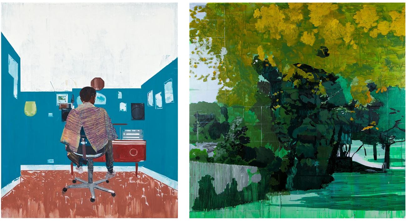 자메이카 혈통의 영국 화가인 ‘허빈 앤더슨(Hurvin Anderson>’의 작품들은 그런 더운 여름날 찾게 되는 그늘과도 같다. 허빈 앤더슨은 이발소 풍경, 길거리 간판, 풍경 등 일상에서 자주 볼 수 있는 이미지를 소재로 작업한다. 그의 풍경 작품에는 다양한 초록색의 풀들과 나무들이 존재한다. 건물과 함께 있는 초록색의 발자취는 물론이고 무수한 나무들 아래에 있는 사람들의 모습까지 볼 수 있다. 그러한 작품을 보다 보면 더운 여름날 그 나무 밑으로 들어가고 싶게 하는 매력적인 작품들로 관람객에게 다가간다.