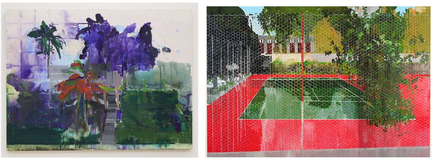 오른쪽의 <Chicken Wire> 작품은 이 작가의 작품 중 가장 비싸게 판매되었다고 알려져 있다. 허빈 앤더슨의 Country Club 시리즈 중 하나인 이 작품은 육각형의 섬세한 스크린으로 가려진 빈 테니스 코트를 비교해서 보여준다. 앞에서 언급한 ‘피터 도이그(Peter Doig)’가 향수를 불러일으키는 기억과 미디어화된 클리셰를 통해 낭만적인 풍경화를 제시한다면 앤더슨은 목회자의 배척과 금지의 역사에 대한 반성을 불러일으키기 위해 지각할 수 없을 정도로 매력적이고 거의 감지할 수 없는 장벽을 가지고 관람객에게 보여준다. 구상과 추상의 경계를 흐릿하게 하는 앤더슨의 회화는 자메이카 이민자 가족 출신으로 영국에서 자라며 경험한 기억들, 자신의 뿌리가 스쳤을 캐리비안에 대한 막연한 그리움 등에서 비롯되었을지도 모른다. 그래서인지 앤더슨의 많은 작품은 명확한 하나의 이미지가 아니라 혼재되고, 뒤섞이고, 만들어진 화면을 구성하기에 우리는 혼재된 화면 속에서 다양한 감정을 느끼는 것이다. 이 작품 역시나 육각형의 철망 사이로 보이는 초록색의 향연을 볼 수 있다. 초록색과 정 반대 색인 붉은색과의 대비는 오묘한 느낌을 전달하고 그 속에 자리한 나뭇잎과 네트 중앙의 초록색은 관람객에게 평온함을 역시나 전달한다. 덩어리진 초록색 풀 중 철망 사이로 삐져나와 빛을 받은 연둣빛 잎들은 그 공간의 기억과 추억을 함축적으로 담고 있는 듯하다. 막연히 이 작가의 배경을 모르고 봤다면 ‘멋진 풍경화네’라고 느꼈겠지만, 앞의 내용을 알게 된 이상 나는 초록색의 향연 속에서 보이는 철망에 눈길이 간다.