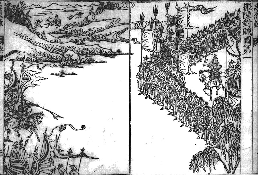 1621년 간행본과 1798년 간행본 모두 첫 번째 그림은 김응하의 초상입니다. 그다음에 차례로 등장하는 전쟁 기록화는 1798년 간행본에 수록된 것을 위주로 살펴보기로 합니다. 첫 번째 그림은 <파진대적도(擺陳對敵圖>. 진을 펼쳐 적에 맞서는 모습을 묘사했습니다. 책의 양면으로 나뉘어 그려진 두 그림이 한 장면을 이루고 있죠. 오른쪽에 질서정연하게 대오를 이룬 조선군 뒤로 말을 탄 장수가 바로 김응하입니다. 반면 왼쪽의 적군은 상대적으로 묘사된 분량 자체가 적어 대조를 이룹니다.