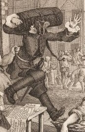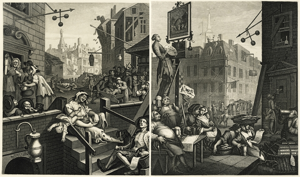 1751년에 그려진 두 작품은 마치 동전의 앞면과 뒷면처럼 주제나 소재 면에서 극명한 대조를 이룬다. 18세기 영국은 값싼 증류주인 진이 유입되면서 빈민가와 저소득층을 중심으로 급속도로 퍼지기 시작했다. 오늘날 마약 중독과 같은 진 광풍은 온 영국을 휩쓸었고 이러한 골칫거리를 해결하고자 영국 정부는 1751년 급기야 진 금주법을 제정한다. 하지만 이것은 진을 더 깊숙한 지하세계로 파고들게 했다.