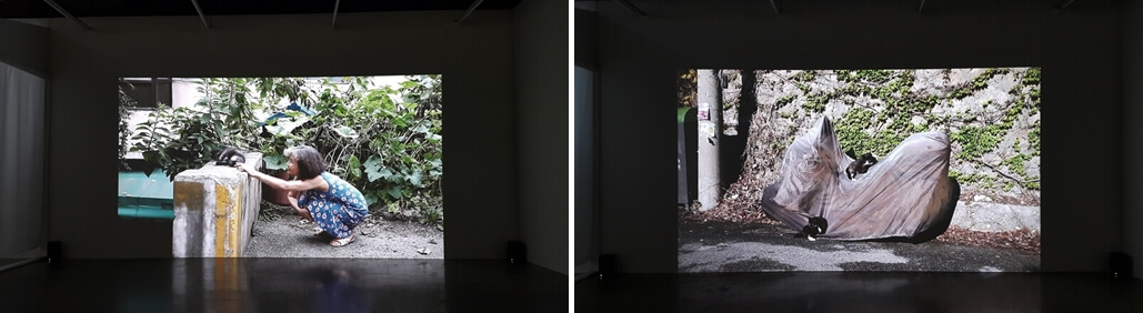 환경 오염, 지구 온난화, 해수면 상승 등과 같은 전 지구적 의제를 특별히 의식하지 않더라도 먹고 마시고 온갖 공산품을 소비하며 살다 보면 개인 생활의 어느 부분이 자연 파괴와 맞닿아 있다는 사실을 깨닫게 된다. 자연과 동물은 지배되고 통제되고 착취되는 수동적 존재로 분류된다. 수동적 존재는 약자이다. 자본이 지배하고 있는 사회에서 가진 것 없는 약자에 대한 무관심과 혐오는 그리 드문 일이 아니다. 재개발 지역인 서울 은평구 갈현동에 위치한 석광사의 풍광을 담은 작업을 통해 홍이현숙은 약자로 살아가는 비인간 동물과 미시적 세계의 생태적 중요성을 온몸으로 역설한다. <석광사 근방>에서 홍이현숙은 고양이의 울음소리와 몸짓을 흉내 냄으로써 자연과 그 속에서 살아가는 동물의 정서를 직접 체험한다. 비인간 생명체의 양태를 몸소 보고 듣고 실천함으로써 작가는 관찰하는 주체와 관찰되는 객체 사이의 거리를 좁히고 인간 외 생물체를 할 수 있는 한 명확하게 인식하고 이해하려고 노력한다.