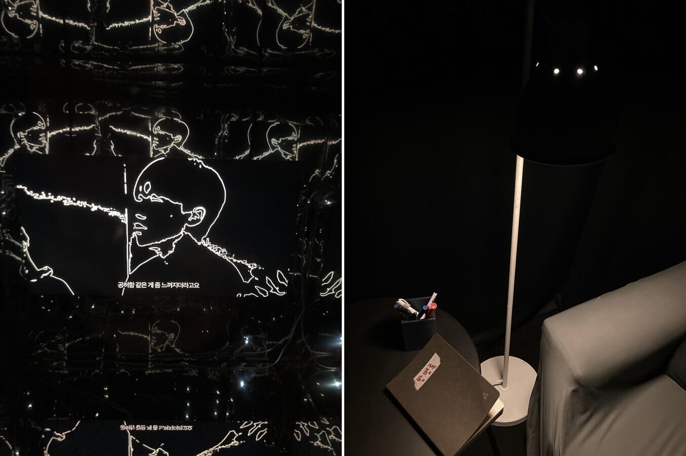 마지막인 502호는 어둡고 아늑한 느낌의 공간이다. 전체 연출을 맡은 정승준이 기획을 맡았다. 투명한 상자 속에는 워크숍에 참여한 이들의 인터뷰 영상이 송출되고, 관람객은 그들의 소회를 들으며 전시를 보고 난 후의 감상을 방명록에 적을 수 있다.
