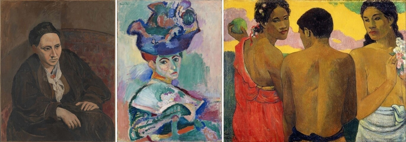 Pablo Picasso, Gertrude Stein, 1905–6 // Henri Matisse, A Woman with a Hat, 1905  //  Paul Gauguin, Three Tahitians, 1899
