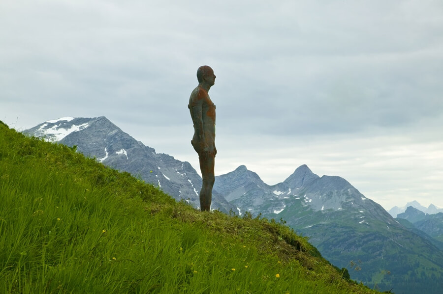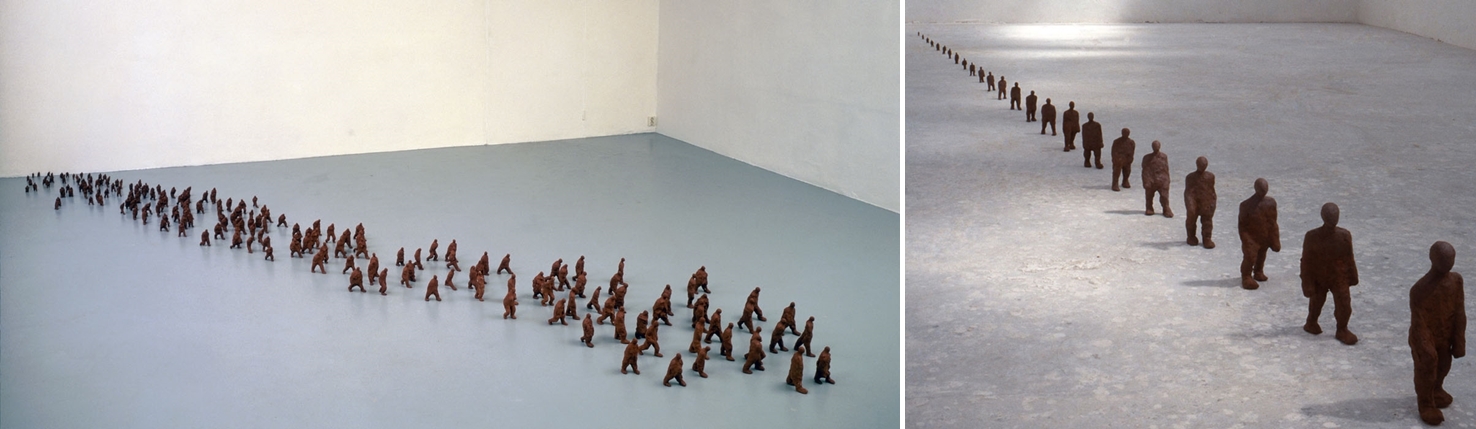 사실 인간의 신체는 미묘하게도 그 사람의 거울이다. 지금 우리의 모습과 자세 그리고 활동만으로도 어떤 사람인가를 알 수 있다. 외형적으로 어떤 외모를 가지고 있다는 것에 대한 것이 아닌 오로지 그 사람의 내면까지 알 수 있는 형체이다. 곰리의 인체조각은 그의 모습을 주조하였지만 외형적으로 그의 형체라는 사실을 두드러지게 부각시키지 않는다. 곰리는 누구나 보편적으로 인지할 수 있는 인간형상을 제작하고자 하였다. 그리고 이로부터 곰리는 인간형상이 본연 자신의 모습을 주조한 자화상의 역할을 담아내면서, 인간이라는 존재에 대한 인식과 사유에 대한 발견으로 이어질 수 있도록 스스럼없이 자신을 재료로 사용하여 인체조각을 제작한다. 일종에 자신을 통해서 인간의 존재를 탐구한다. 이와 같은 설명은 사실은 이를 직접 경험하지 않는다면 알 수 없는 과정이 될 수 있다. 하지만 곰리의 조각을 지속적으로 관찰해 본다면 알 것이다. 곰리의 신체를 조각했다는 그 사실에 더 주목할지 아니면 인간본연의 실존, 그 자체에 대한 관심으로 이어져 이를 바라보는 자신이라는 사람에 대해서 잠시 질문을 던지는 시간이 될 것이다. <잃어버린 지평선 I Lost Horizon I>(2008)에서 곰리는 32개의 인체조각을 전시공간에 설치하였다. 32개의 인체조각에서 중요한 것은 32개를 제작했다는 사실보다, 그들의 자세는 동일하지만 서로 다른 방향으로 각기 향해있는 모습을 발견할 수 있다는 것이다. <세계적 견지>(1993)에서와 같이 <잃어버린 지평선 I>(2008)에서도 곰리는 자신의 모습을 주조했다. 그리고 동일한 인체조각을 세워두거나 혹은 천장에 매달리게 설치하거나 혹은 벽 가운데에 부착시켜, 전시공간을 인체조각으로 가득 채웠다. 그리고 그 사이에 보이는 틈 사이로 그들은 일정한 간격을 유지한다. 서로가 다른 모습을 보여주고 있는 것처럼 설치되어 있지만, 그들은 공동체 속에 함께 살아가는 우리와 같이 동일한 시간에 같은 공간에서 서로를 의식하듯 거리를 가지면서, 각기 다른 방향으로 시선을 보내며 존재하고 있다.