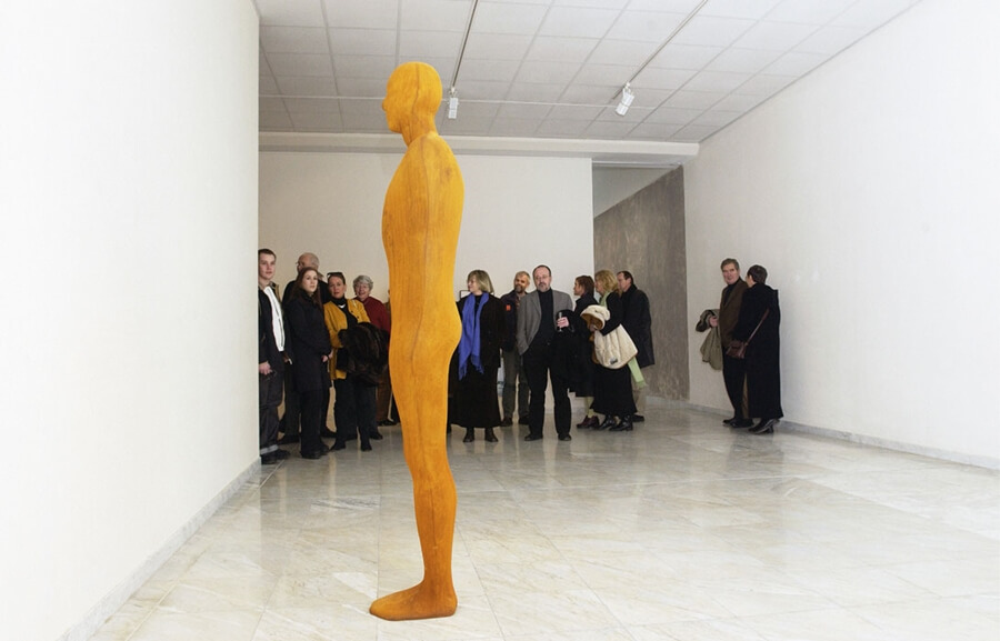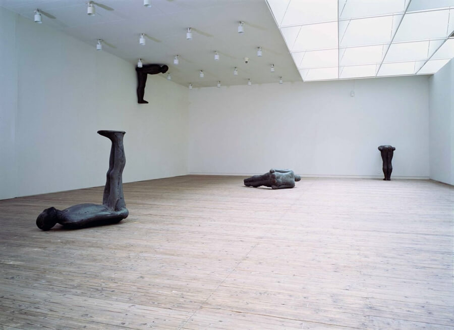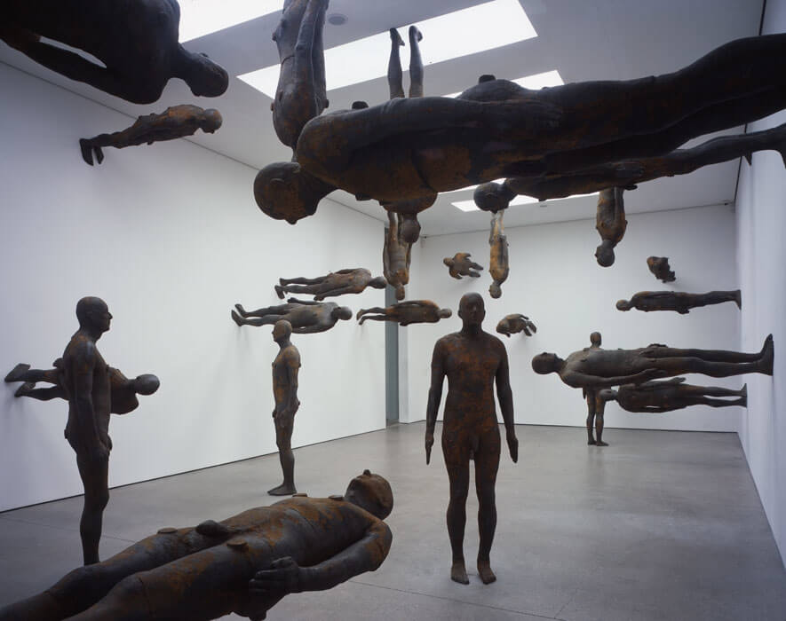 1980년대부터 조각이라는 매체수단을 가지고 자신의 몸을 재료로 실물뜨기를 한 조각가. 바로 안토니 곰리(Antony Gormley, 1950~)이다. 1994년 터너상(Turner Prize)을 받고 그의 대표적인 조각으로 알려진 <세계적 견지 Testing a World View>(1993)는 그를 알리게 되는 중요한 작품으로 알려져 있다. 1993년 테이트(Tate)에서 소개된 이 작품은 자신의 신체에 석고를 바르고 틀을 이용하여 제작한 인간의 형상을 전시공간에 설치하였다. 각각의 인체조각을 자세히 보면, 허리는 펴고 다리를 앞쪽으로 뻗은 상태에 있다. 그리고 전시공간의 바닥과 천장에서 누워있거나 앞으로 향해 있거나 혹은 매달려 있다. 인간의 신체적 활동과 근접한 포즈와 자세로 사람이라는 소재 그 자체를 탐구한 곰리의 조각은 오귀스트 로댕(Auguste Rodin, 1840~1917)의 조각에서 느껴지는 근육의 질감이 두드러지지도 않으면서, 조지 시걸의 조각처럼 옷의 느낌이 묻어나거나 혹은 얼굴의 이목구비와 표정과 행동과는 대조적인 인간에 대한 발견이다. 곰리 자신으로부터 시작된 조각의 여정은 조지 시걸(George Segal, 1924~2000)의 조각과 맞닿아 있으면서도 도시에서의 삶과 일상에서의 고독과 불안이라는 감정의 소용돌이나 사회공동체에서의 생활과 활동에서 벗어나 오로지 인간 자체, 즉 자아에 대한 탐구를 보여준다.
