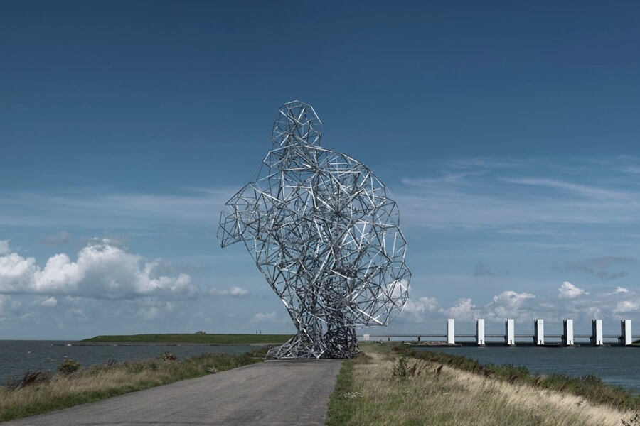 사람은 인간존재에 대한 발견이 시작될 때, 같은 공간에 타인이 존재하지 않는다는 전제에 자신의 정신과 신체에 온전히 몰입하는 시간을 갖게 된다. <두 배>(1997)에서의 두 인체조각의 존재에서 보다, 혹은 거울에서 마주하는 것과는 다르게 일정한 공간 속에 단 하나의 인간의 신체를 마주하는 순간, 거리를 두는 것에도, 타인에 대한 의식이 없어진다. 전적으로 그 인체조각의 자체 본질을 탐구하려고 하며, 우리의 신체는 단지 형상에 불구하고, 이를 구성하는 파편적이고 유기체적인 형태가 부분 간의 관계로 이어져 있다는 생각으로까지 이어진다. 특히 나라는 사람에 대해 더욱 집중되어지면서 자신에 몰입하는 과정을 경험하게 된다. <퀀텀 클라우드 Quantum Clound IX>에서 곰리는 <부러진 기둥>(2003)과는 다르게 외형적으로는 인간의 신체이지만 자세히 들여다보면, 내부가 훤히 들여다 보이게 제작했다는 사실을 알 수 있다. 곰리는 강철로 인간의 신체를 구성하는 내부적인 구성을 길이가 서로 다르게 지그재그로 연결시켜, 개체 하나 하나가 형상을 만들어내는 그 과정을 상기할 수 있게 한다. 특히 나라는 사람이 만들어지기까지의 과정에서 일어나는 파편적인 일들, 시간, 공간, 활동, 경험 등이 결합되어 자아정체성을 만들어가는 그 지점을 시각적으로 두드러지게 한다. 그리고 네덜란드 폴레볼란트 주에서 진행한 <노출 Exposure>(2010)에서도 곰리는 강철로 인체의 골격구조를 <부러진 기둥>(2003)보다 더욱 거대하게 제작하였다. 전시공간에서 만난 인체조각이 자연으로 나왔다. 멀리서 보이는 <노출>(2010)는 홀로 바다를 배경으로 웅크리고 앉아있는 인간의 모습이다. 가까이서 이를 본다면, 인간의 모습보다는 커다란 골조로 조합된 조각의 형상과 닮아 있다. 누구나 <노출>(2010)을 멀리서 응시한다면, 인간형상을 보게 되지만 이를 가까이 가서 경험할수록 멀리서 바라본 모습과는 다르게 무엇인지를 알기에는 잠시 어려움을 가지거나 사람의 형상에 가깝기보다는 추상적인 조각으로 우리의 마음속에 담아진다.