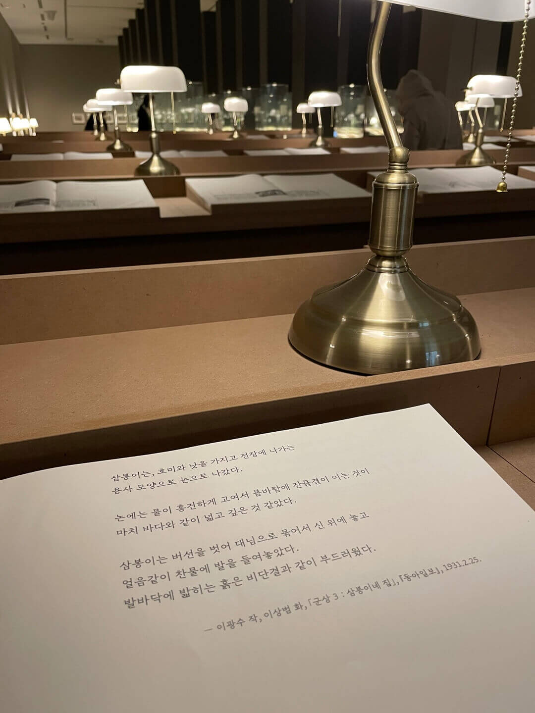 탁상 위에 문인들의 시를 엮은 인쇄본이 자리한다. 직접 종이를 넘겨가며 그 시대 고유의 감성을 느낄 수 있는 데, 그 큰 역할을 한 건 테이블에 올려진 전등이지 않을까 싶다. 초롱불 아래서 그 시절을 담아냈던 그들의 모습이 기분 좋은 소리를 내는 종이에 안착해 관객과 소통한다. 가난하고 모순으로 가득 찼던 시대 한가운데에서도 정신적으로는 그 누구보다 풍요롭고 ‘귀족적’이었던 그들의 멋진 신세계를 마주할 수 있다. 더불어 윤동주도 필사해서 봤다는 100부 한정판 백석의 『사슴』에서부터 김소월의 『진달래꽃』 , 서정주의 『화사집』 , 윤동주의 『하늘과 바람과 별과 시』 등 당대 수많은 독자들을 감동시켰던 책들의 원본을 감상할 수 있다.