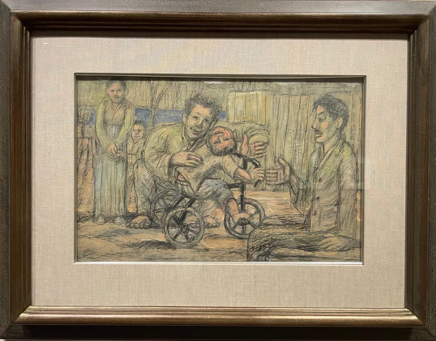 <시인 구상의 가족>은 가족과의 재회의 꿈에 부풀었던 이중섭이 그러한 희망을 완전히 포기하게 되었을 때 극심한 ‘절망’ 속에서 제작한 작품이라고 한다. 그는 1955년 1월 개인전이 경제적 실패로 돌아가자, 이후 일본에 있는 아내와의 연락을 단절하고, 오래된 친구 시인 구상의 왜관 집에 머물러 있었다. 구상이 자신의 아들에게 자전거를 사서 태워주자, 이를 몹시도 부러워한 이중섭 자신의 모습이 담겨있다. [전시 중 발췌]