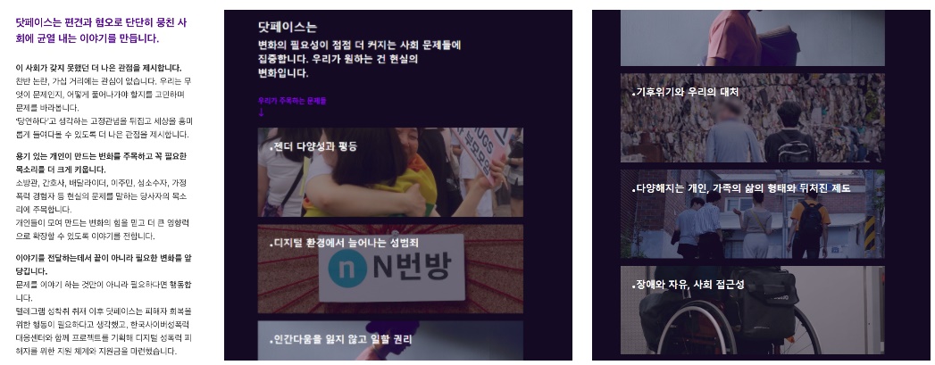 닷페이스는 당사자의 목소리를 통해 편견과 혐오를 깨트리고 필요한 변화를 만들어나갑니다. 따라서 사회의 다양한 문제들에 주목할 수밖에 없죠. (출처:dotface.kr)