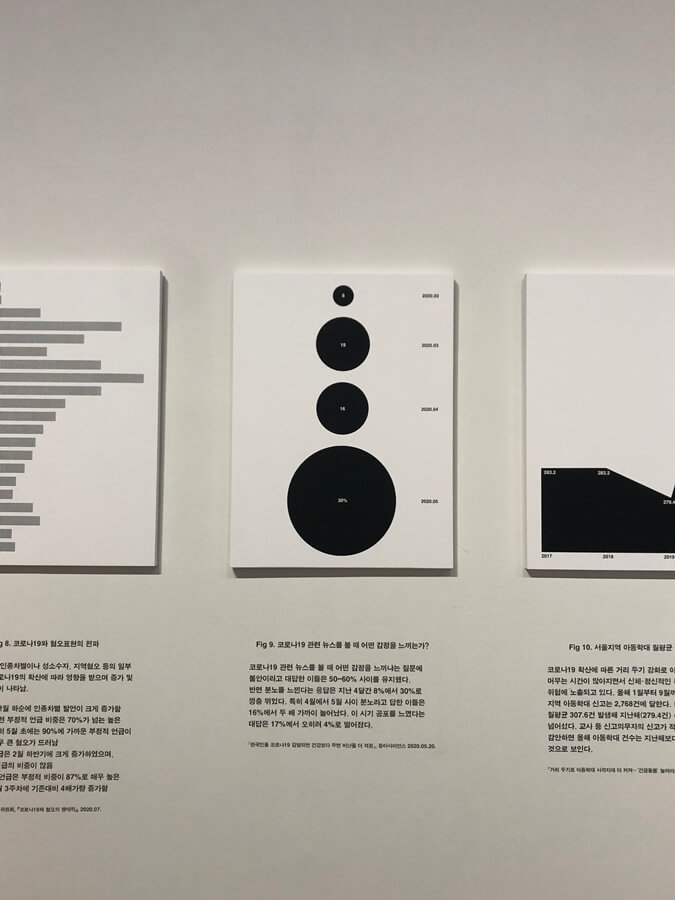 이지원(아키타입)의 <팬데믹 다이어그램(The Unequal Pandemic)>(2021)은 팬데믹 기간 동안 축적된 다양한 통계자료와 데이터들을 수집하고 분석하여 그래픽적으로 시각화한 작업이다. 열 개의 패널과 웹사이트로 구성된 이 작품은 여성 고용추이, 플랫폼 노동자 노동가입 현황, 콜센터 좌석 배치도, 서울지역 아동학대 월평균 현황 등의 다이어그램을 통해 사회적 불평등, 차별과 혐오 그리고 사회 안전망의 사각지대에 놓인 계층의 삶과 사회적 취약구조 깊숙이 침투된 불평등과 오류들을 드러낸다.