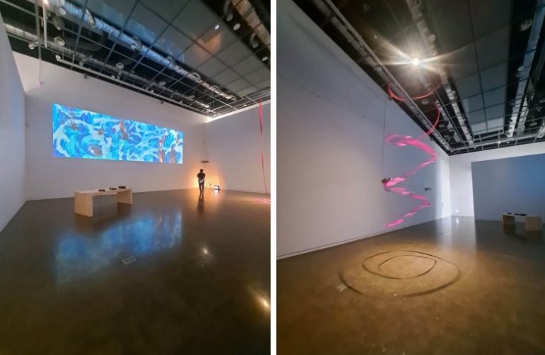 이와 달리 설치작업에서는 작가의 감정이 절제된 선의 조형성이 묻어난 상호보완적인 느낌이 전달된다. 선이 배경에서 동떨어져 회화 애니메이션에서 면의 경계, 분할의 개념을 느꼈다면 설치작업에서는 분리의 개념에 더 가까운 메시지를 전달한다. 관객이 다가갔을 때 센서에 의해서 소용돌이를 치면서 계속해서 말려 올라가는 선의 반복이 하나의 패턴으로 규칙적이고 불규칙한 구성이 구조한다. 그 구조에서 상, 하의 수직과 수평을 연상시키고 상호유기적인 선들이 교차해 평행과 병행으로 법칙성을 가지며 연속적인 확장으로 구조물을 완성한다.