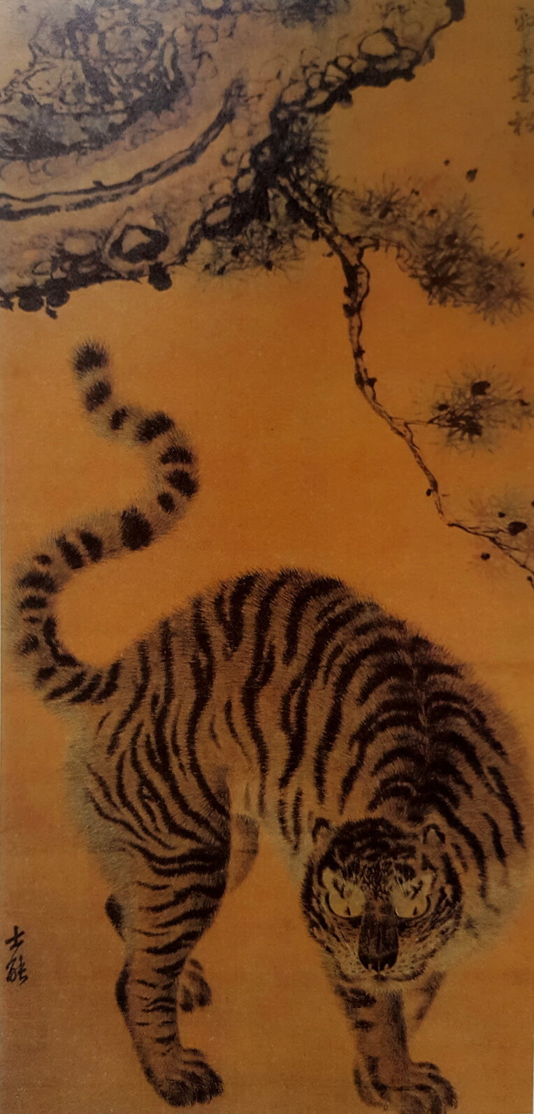 어마어마한 아우라가 있는 그림이지요. 이 작품은 1m가 되지 않는 크기인데도 어슬렁거리며 다가오는 호랑이의 압도하는 기세가 화면에 꽉 차 있습니다. 호랑이의 등뼈와 꼬리를 보세요. 산과 골짜기와 나무와 풀이 떨고, 천지(天地)를 품는 위엄이 느껴집니다. 털 한 오라기까지 태산을 호령하는 목소리가 들리지요. 호랑이는 그냥 맹수가 아닙니다. 주역에 의하면 '대인(大人)'을 뜻하지요. 큰 덕을 펼칠 사람 말이에요. 누가 이런 위엄 있으면서도 우아한 영물을 그릴 수 있겠어요. 역시! 김홍도입니다.