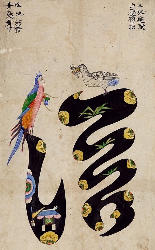 문자도란 문자를 그림 형태로 나타낸 것입니다. 성리학의 나라였으니 아무래도 충(忠), 효(孝), 신(信), 의(義) 같이 선비들이 지켜야 할 가치를 문자도로 나타낸 것이 가장 많습니다. 각 글자마다 고사가 있어요. 예를 들어 신(信)에는 청조(靑鳥, 푸른 새)와 백안(白雁)의 고사가 있습니다. 청조는 몸은 새인데 머리는 사람의 형상을 가진 상상 속의 새입니다. 곤륜산에 산다는 서왕모 설화에서 비롯되었지요. 한나라 때, 무제의 궁전에 청조가 날아들자 삼천갑자를 살았다는 동방삭이 무제의 궁전에 서왕모가 방문할 것이라는(선택받았다는 의미) 일종의 예언을 통해 약속과 믿음의 상징이 되었습니다.