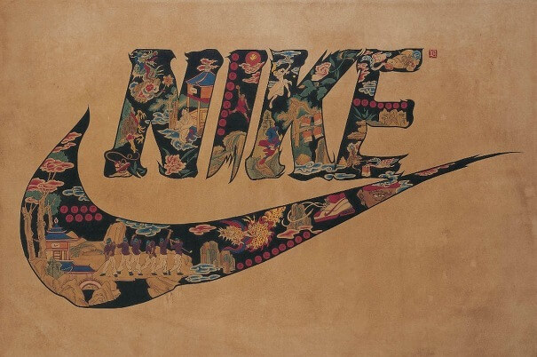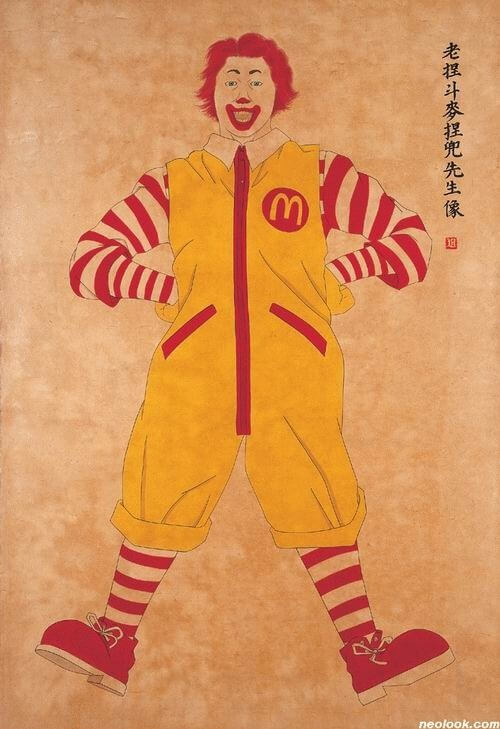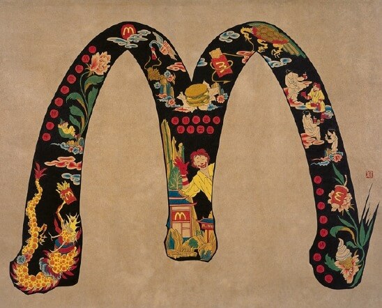 정말 독특하지요? 전통을 현대적으로 해석했다고 할까요? 민화의 문자도 양식을 차용한 맥도널드에 있는 햄버거와 캐릭터를 보세요. 버거킹에는 감자튀김이 있고, 나이키에는 운동화 끈이 산을 두르고 있네요. 그는 시대의 아이콘을 그려놓고 캐릭터의 이름은 한자의 가차 문자(어떤 뜻을 나타내는 한자가 없을 때, 그 단어의 발음에 부합하는 다른 문자를 원래의 뜻과는 관계없이 빌려 쓰는 방법)처럼 나타냈습니다.
