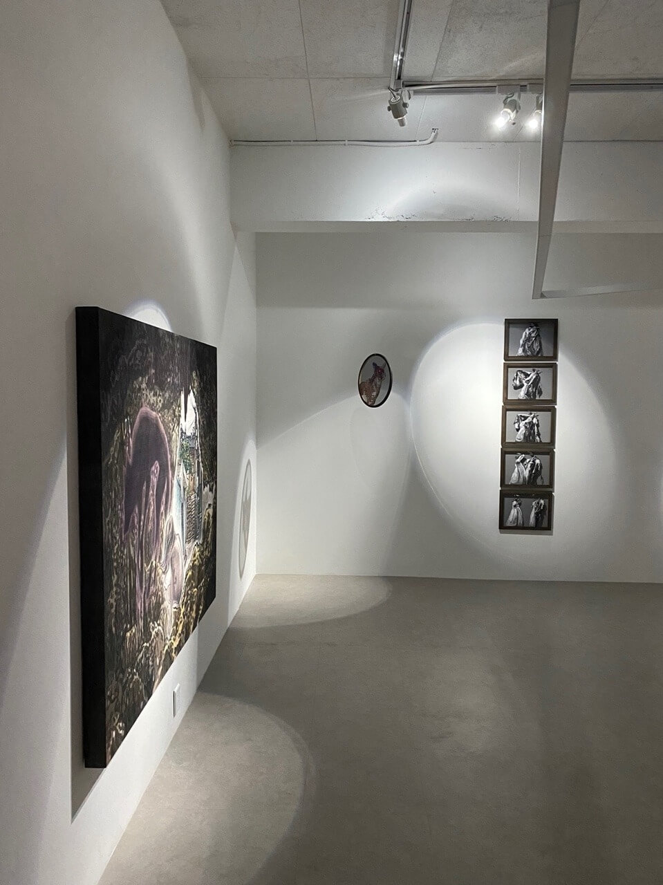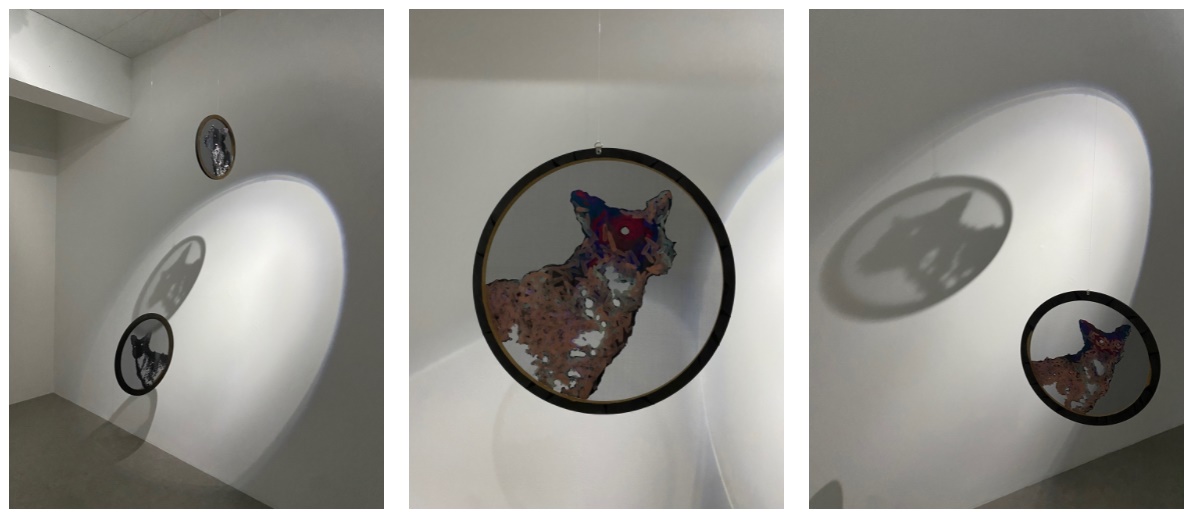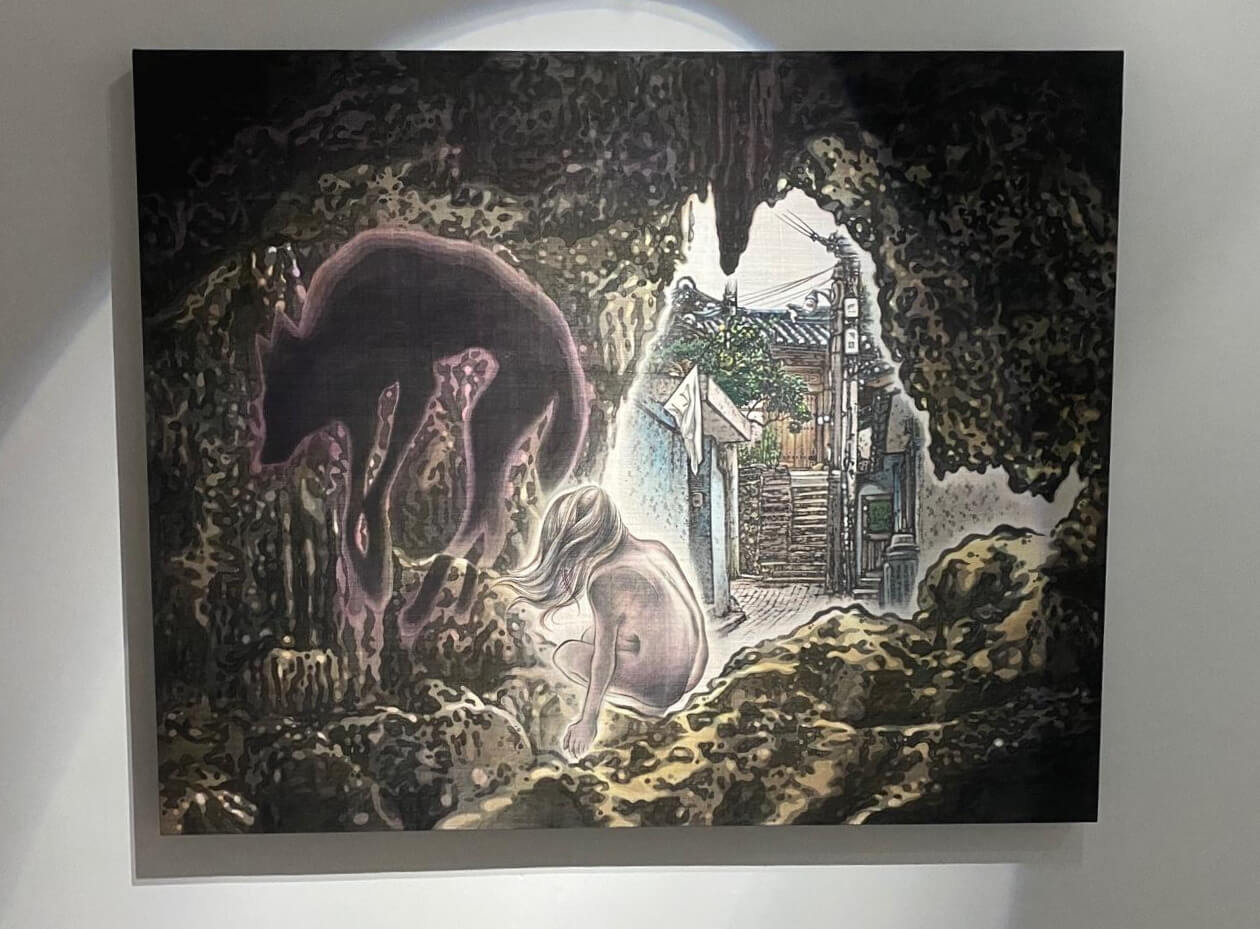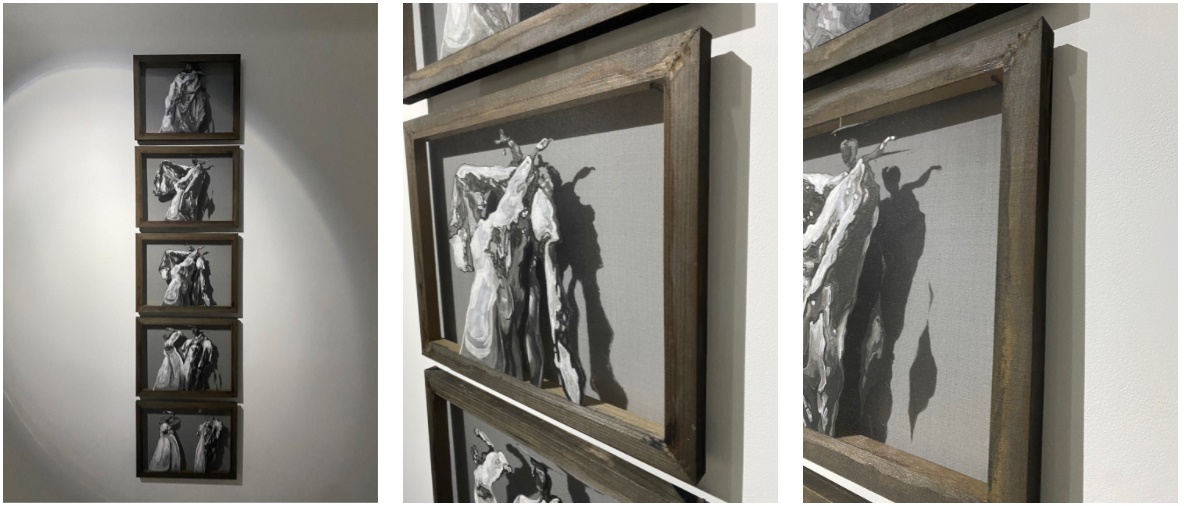 <포옹>에서의 연쇄적 움직임은 비단 위에  먹과 호분의 질감으로 입체적 몸짓이 되며, 이는 빛에 의해 생기는 프레임 밖의 그림자로 이야기를 이어갈 수 있게끔 새로운 공간을 제공한다.