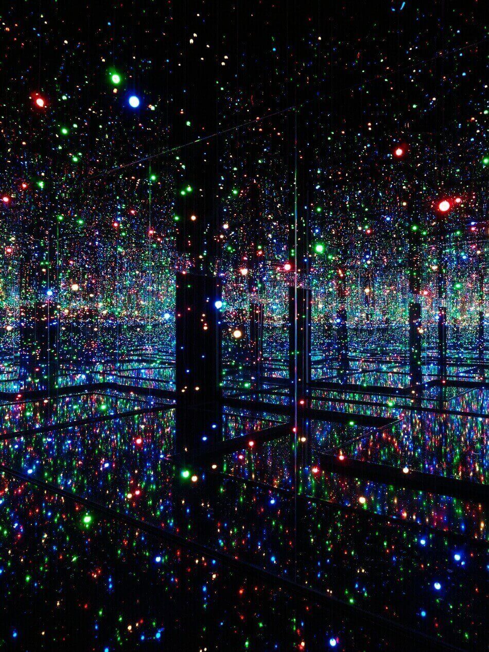 Yayoi Kusama Infinity Mirror Rooms is a rare chance to experience two major installations alongside fascinating early documentation of Kusama’s experimental performances and events, as well as a brand-new sculptural work that continuous the theme of endless replication. The exhibition features infinity ivlirrored Poom — filled with the Brilliance of life, one of Kusama s largest installations to date and originally created for her 2012 retrospective at Tate Modern.