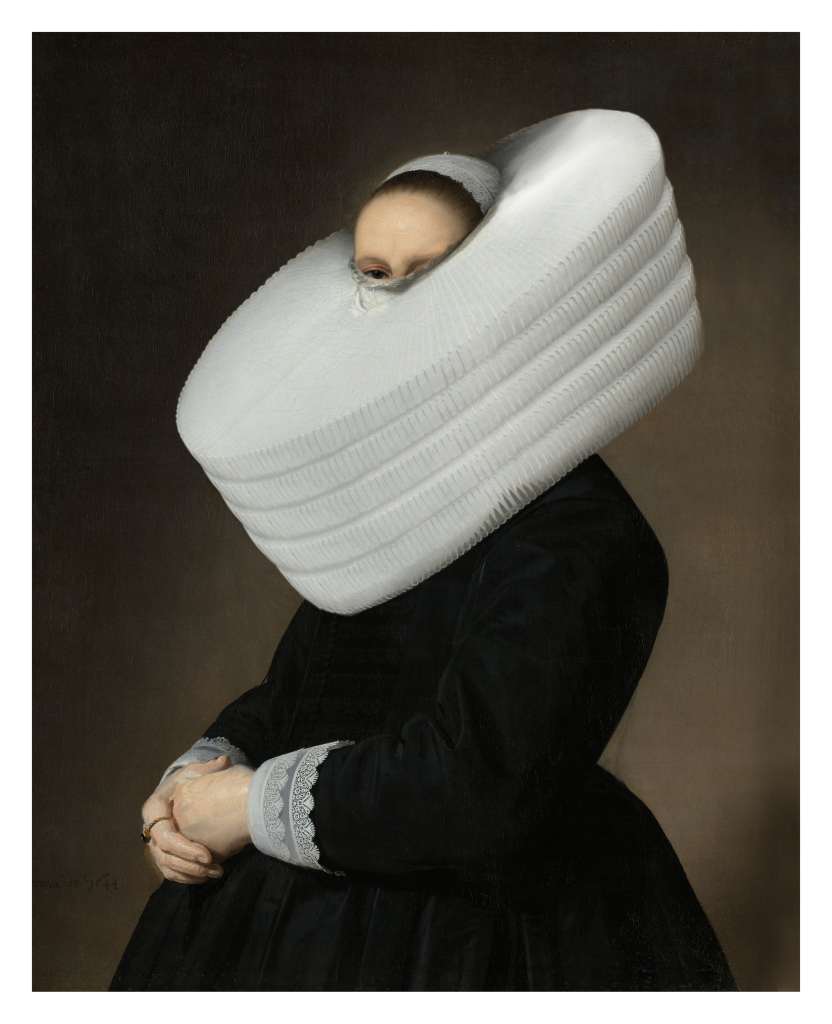 작품은 1644 네덜란드의 요하네스 코르넬리스 베르스프론크가 그린 아드리아나 크로에스의 초상화이다. 헤르메스는 원작의 주인공이 상류층임을 나타내는 뻣뻣한 레이스 러프를 한 개에서 네 개로 늘렸고, 목 만을 덮어야 하는 러프는 여인의 눈 밑까지 가리며 마치 거대한 도넛을 두르고 있는 듯한 우스꽝스러움을 자아냈다.