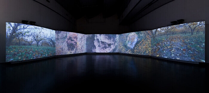 병풍처럼 둘러선 5개의 화면으로 경기도 안성의 배밭이 펼쳐진다. 50여 년의 시간을 넘기며 일구고 가꿔온 풍경은 바람 소리 하나 없이 적막한 가운데 느리지만 뚜렷한 차이를 보이며 계절을 통과한다. 흙냄새가 질펀하게 풍기는 땅의 어딘가로 연둣빛 싹들이 밀려오면 세상은 빈틈없이 꽉 들어찬 생명의 그릇이 된다. 낮은 배나무들이 흰 꽃을 매달고 무심히 견디면, 한 알 한 알의 열매들이 시간 속에서 영글며 그 사이사이로 숨골을 틔우듯 사람들의 환한 얼굴이 지나간다. 모든 살아 있는 것들이 스스럼없이 어우러지면서 세상은 하나로 비벼져 반짝거린다. 그러다 계절이 돌아 하얀 천으로 덮은 듯 세상이 둥글게 묻히면 어스름한 윤곽 위로 자연의 구경꾼이 살금거리며 지나간다. 땅이 민낯을 드러내고, 바람골이 트여 듬성하게 결을 흩으면, 모든 높낮이가 수평으로 다듬어져 불쑥한 언덕들이 도드라지게 드러난다.