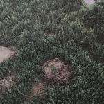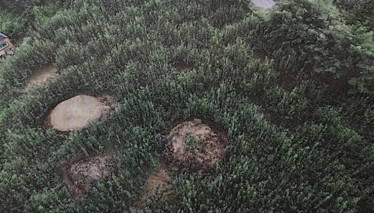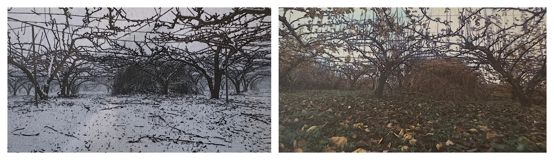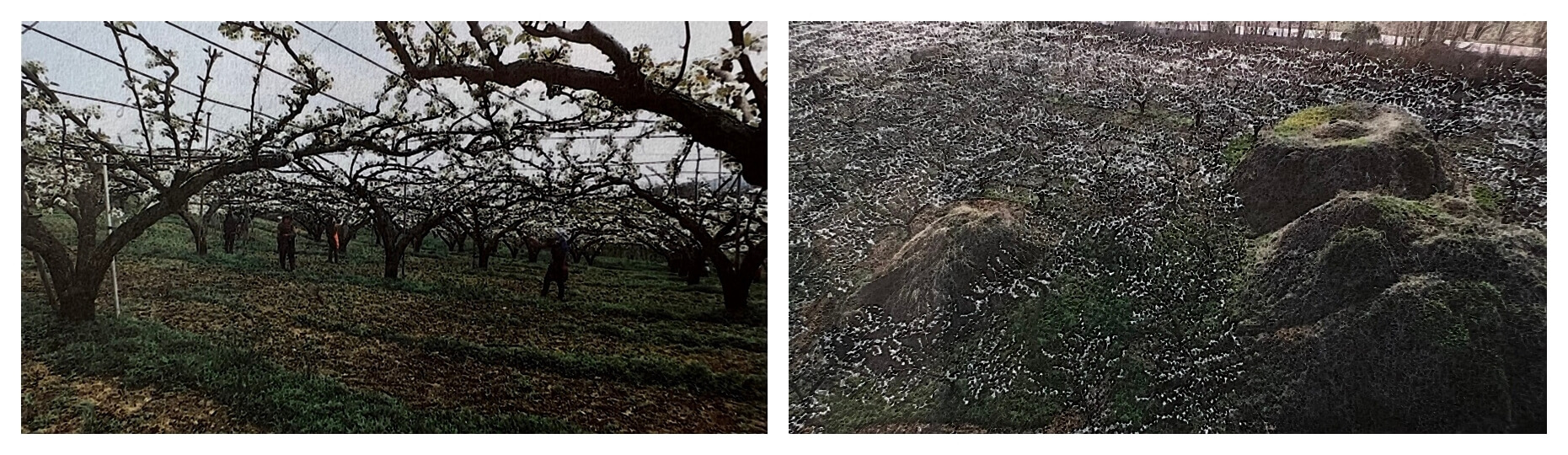 그것은, 느닷없고 갑작스레 솟아오른 무덤이다. 이름을 잃고 땅이 되어 아직은 그 흔적을 채 지우지 못한 무연고자의 무덤이다. 과수원 주인은 타인의 무덤에 손대기를 삼갔고, 이름 없는 무덤을 그대로 둔 채 땅을 일궈 과수원을 꾸렸다. 산 자들이 다지고 일군 땅은 조금씩 밟혀 아래로 낮아지고, 죽은 자의 육신은 그대로 남아 아무 노력 없이 허공으로 떠올랐다. 봉긋하고, 두리뭉실하며, 뜬금없는 자국들이 그렇게 풍경 속에 자릴 잡았다. 산 자는 움직이고 죽은 자는 붙박혀 서로를 보듬는, 삶과 죽음이 맞닿은 풍경이다.