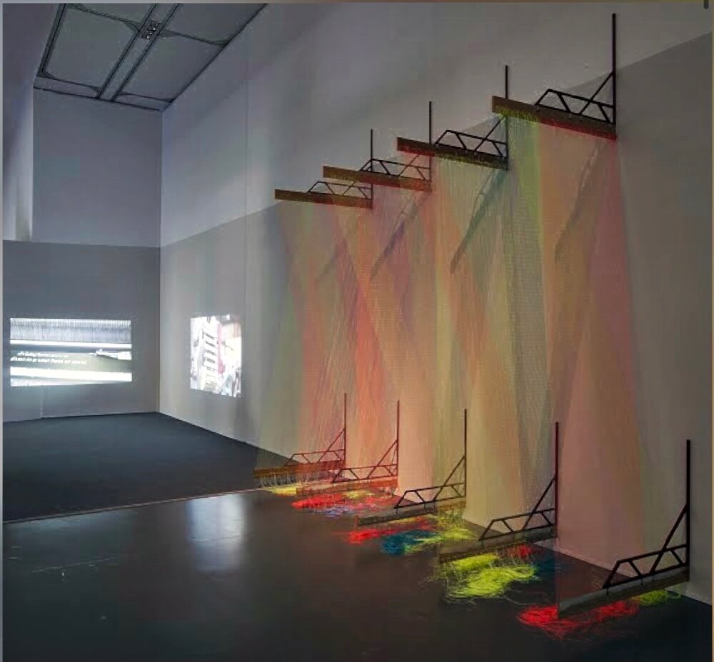 <연경Tying>부분, 2014, 3채널 비디오, 자카드와 실 설치, 컬러, 사운드, 2423,