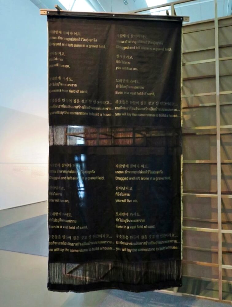 잘 빗어넘긴 머리카락처럼 가지런한 실이 반듯하게 공간을 가른다. 한 줄 한 줄의 팽팽함이 긴장감을 만들고 화려한 색상이 악기의 현처럼 리듬을 탄다. 기계 소음과 목소리, 함께하는 영상 속에서 태국의 방직산업현장과 70~80년대 우리나라의 방직산업현장이 교차한다. 젊은 노동자의 얼굴은 태국 여성이었다가 우리나라 여성이었다가, 국적을 구별할 수 없는 얼굴이 되어 이야기를 이어간다. 권용주 작가의 <연경Tying>은 태국 아트 프로젝트에 참여해 제작된 작품이다. 작가는 방직 공장 노동자로 젊은 시절을 보낸 어머니의 회고와 태국 방직 공장의 젊은 여성 노동자의 인터뷰를 하나의 서사로 연결한다. 자본주의 사회에서 끊김 없이 노동을 이어가며 생계를 위해 실을 잇고 있는 여성 노동자들의 삶은 지역과 상관없이 닮았고, 30년의 시간이 흐르도록 변함없었다. 그녀들은 방직 작업의 한 과정처럼 매끈하게 이어지는 한 가닥 실과 다르지 않았다.