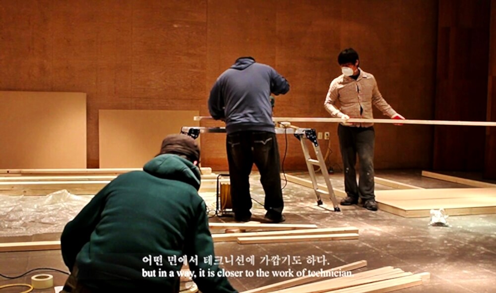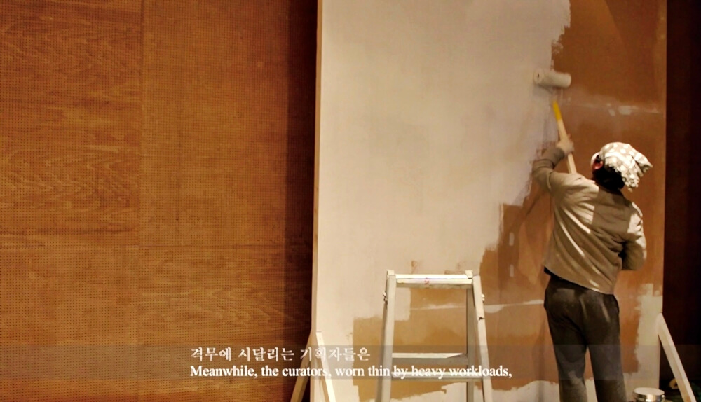 한 마디로 딱 잘라 말할 수 없는 애매함. 하고 싶은 일과 해야 할 일의 불일치에서 오는 쭈뼛거림. 먹고 사는 일이 직업이라면 그의 직업은 전시장 보조 인력정도일까. 그러나 그는 엄연한 예술가. 본업과 부업이 우선순위를 바꾸며 때때마다 달라져도 생활력이 강한 예술가는 지칠 수 없다. 우리 모두 먹고사는 일이 얼마나 중요한 일인지 알기에 이런 분신술(!)쯤은 쉽게 이해가 된다. 다른 작가의 배경이 되기 위해 자신의 몸을 움직이고 있는, 그 자신이 가장 갖고 싶은 공간을 남에게 내줘야만 하는 상황은 씁쓸하다. 이루고 싶은 일을 이어나가기 위해 부가적으로 이뤄야 하는 일이 오히려 더 막중해질 때, 이 모순된 상황이 예술가의 외면 당한 노동 현실이다.