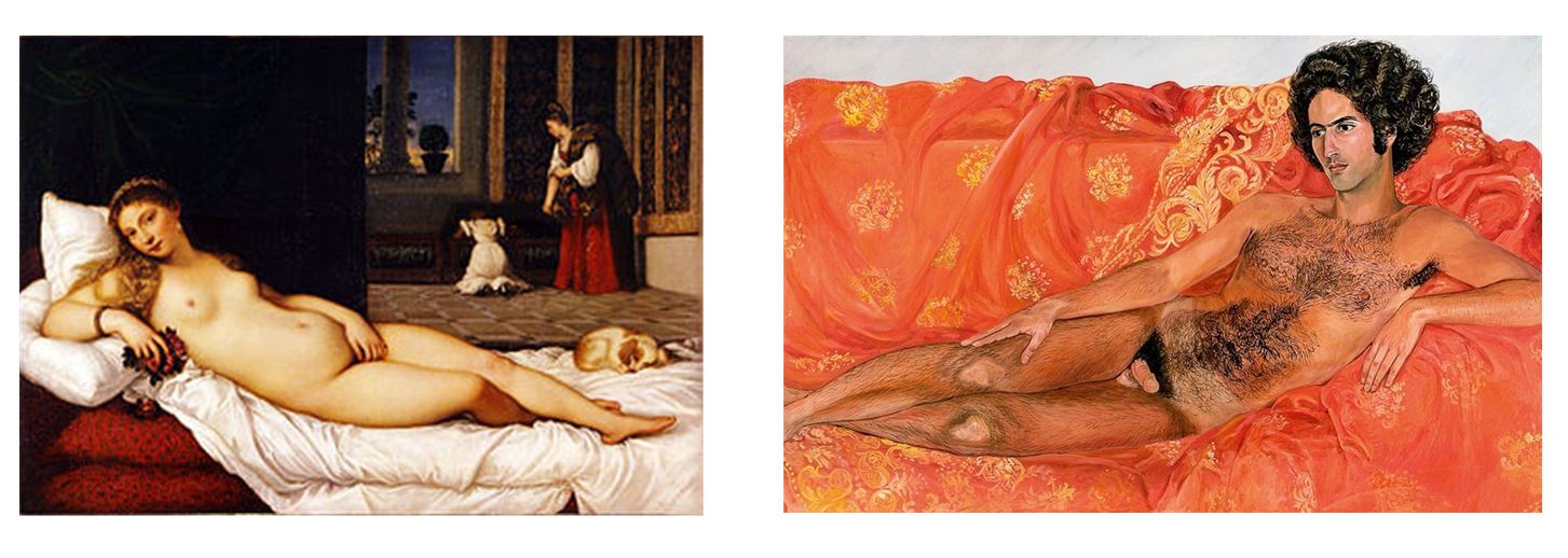 티치아노 <우르비노의 비너스>와 실비아의 <Imperial Nude>, 이 두 작품은 구도나 구성이 비슷하다. 실비아는 고전 회화의 구성을 가져와 남성을 주인공으로 하며, 남성과 여성의 동등함을 강조하고 싶었다. 왜 여성만 유혹하는 포즈로 누워있어야 하는가. 남성과 여성의 몸은 동등한 아름다움을 가진 것이라 말하고 싶었다.