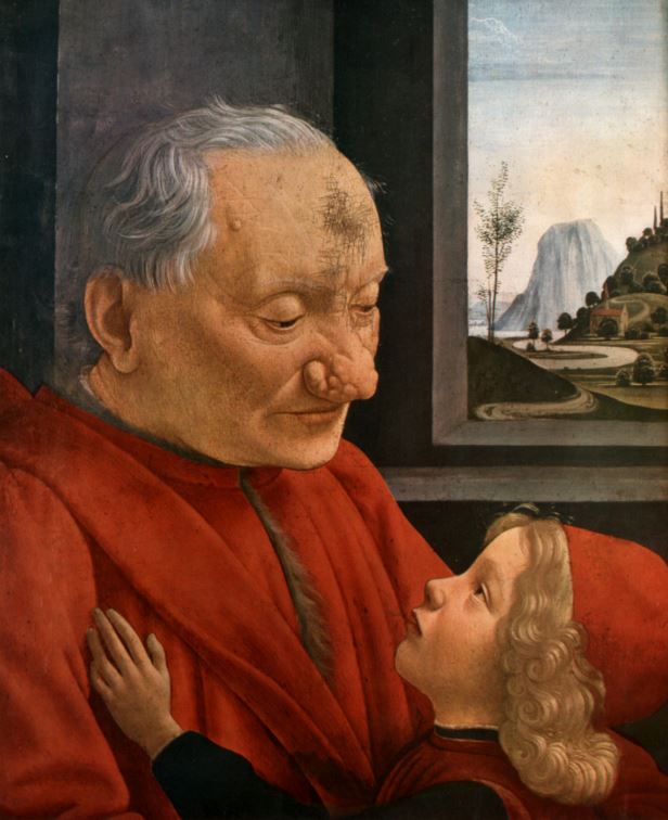 여기 한 명의 노인이 있다. 노인은 붉은 옷을 입고 있으며, 이마가 넓고, 머리는 백발이다. 코에는피부병이 있는지 사마귀 같은 것이 한가득 나 있다. 조금만 아래로 눈을 돌리면, 대여섯살쯤 돼 보이는 어린 소년이 있다. 풍성하고 윤기가 흐르는금빛 머리칼에 피부는 잡티 하나 없이 깔끔하다. 소년 역시 붉은 옷을 입고 있다. 아이는 할아버지의 가슴에 한 손을 올리고 눈을 쳐다본다. 할아버지역시 소년을 쳐다본다. 창 밖에는 정말로 창 밖으로 보일 법한 평화로운 풍경이 보인다.