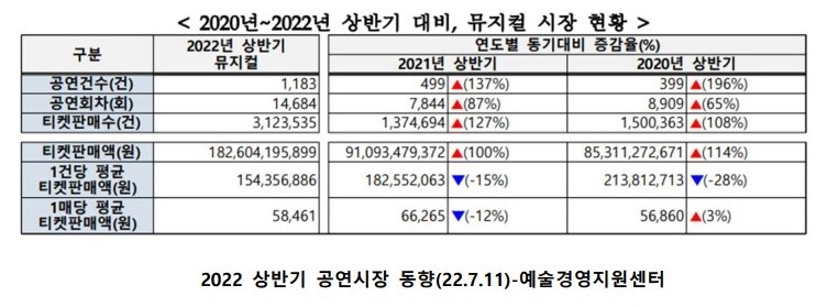 팬데믹 초입이었던 2020년 상반기, 85,311,272,671원이었던 티켓 판매액이 팬데믹을 거쳐 2022년 상반기에는 182,604,195,899원에 이르는 저력을 보여 주었다. 팬데믹 시기에 공연 중계 영상을 보고 처음으로 뮤지컬이라는 장르를 접한 ‘생애 첫 관람층’이 대거 유입된 결과로 보인다. 많은 우려 속에 시작된 공연 스트리밍 서비스는 이처럼 매우 고무적인 결과를 낳았다.