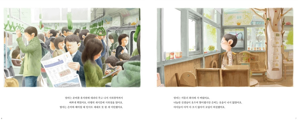 여백이 없이 빽빽하게 채워진 사실적인 배경 묘사는, 마치 한 편의 다큐멘터리 영상을 보는 듯한 착각을 불러일으킵니다. 책을 덮을 때가 되면, 이 두 주인공의 현실에 가슴이 시려, '인간극장'을 본 듯한 여운이 남게 되기도 하지요. 외벌이로는 도저히 도시에서 살아가기 힘든 현실. 우리 사회는 엄마들이 슈퍼우먼이 되기를 강요하고. 엄마들은 자신을 채찍질해야만 합니다. 엄마와 직장인. 두 가지 역할을 씩씩하게 해내는 이 도시의 수많은 워킹맘들에게, 책은 응원의 메시지를 보내고 있는 것 같네요. '워킹맘이여 그대들은 위대하다!' 워킹맘! 그대들은 정말로, 정말로 , 위대합니다!