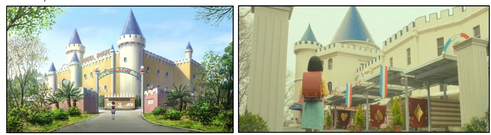 어린 소녀 나루세 준의 모습에 보였던 성은 실제로는 러브호텔이었다. 주인공은 동화책을 보면서 '...아름다운 성 안에서 왕자님과 공주님이 행복하게 살았습니다.” 로 끝나는 해피엔딩에 대한 환상을 가지고 있는 순수한 캐릭터였다. 이 애니메이션의 부제는 Beautiful Word Beautiful World 이다. 2015년에 개봉되어 많은 인기를 누린 애니메이션으로써 동명 타이틀로 실사 영화로도 제작이 되었다. 실사영화 부분에서는 성이 나오는 부분이 무척 궁금했는데 두 개의 사진을 비교해보면 거의 동일한 모양으로 감독은 이 부분에 대한 필터링없는 묘사를 한 것이 매우 인상적이다.